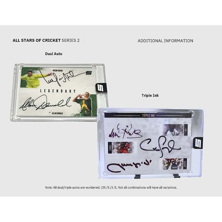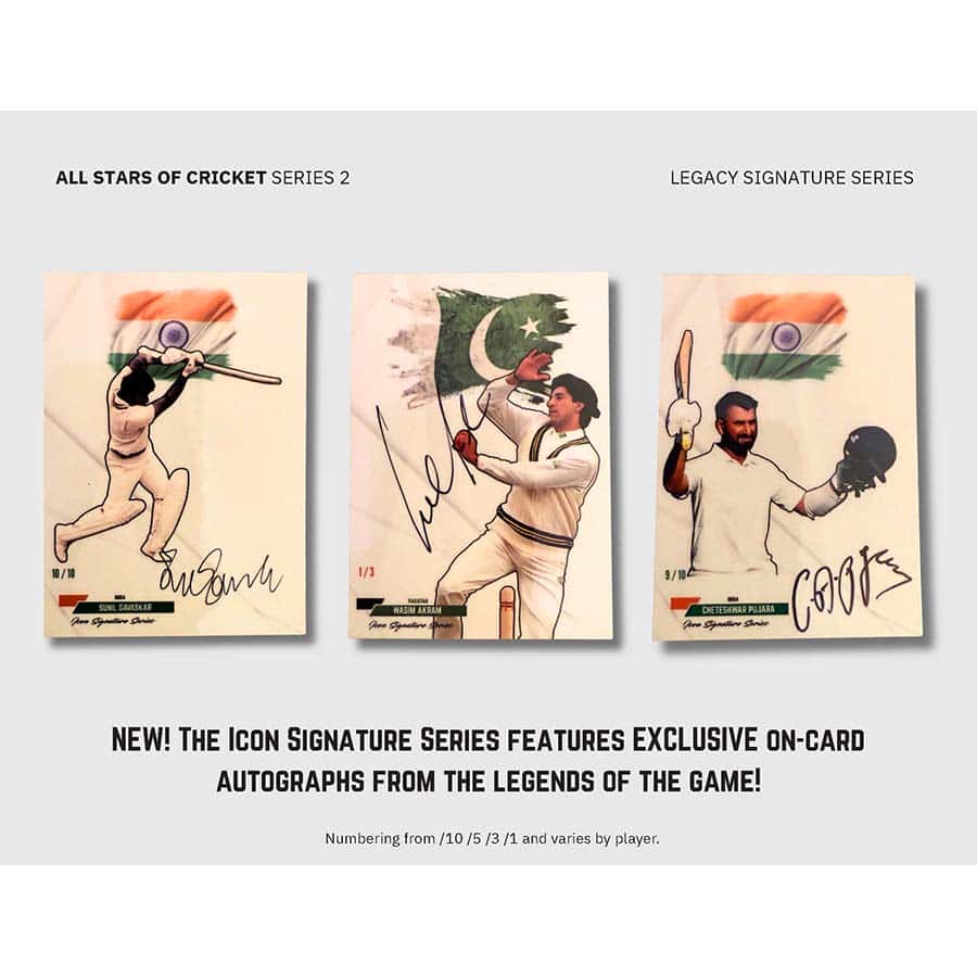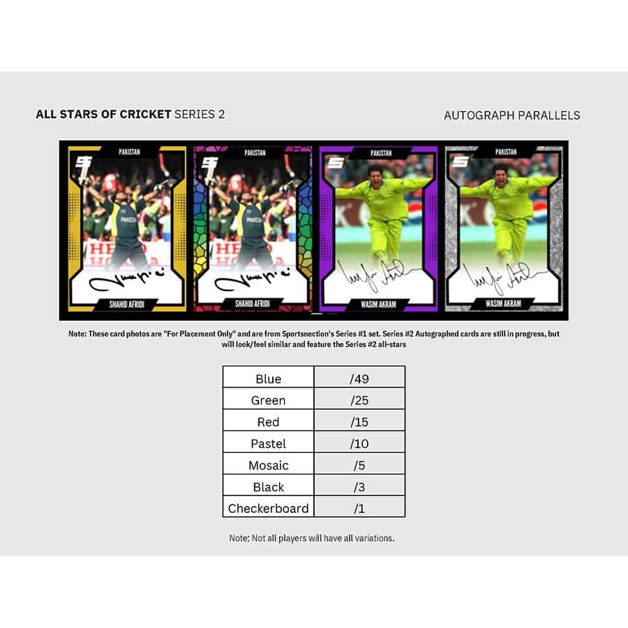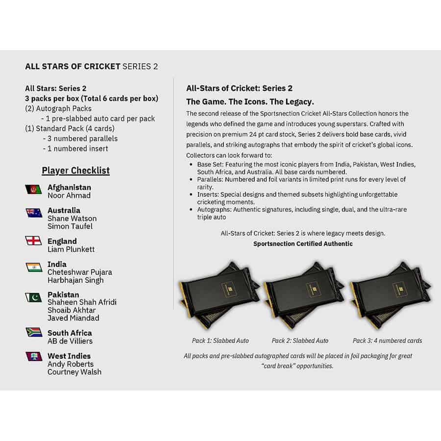 The Series 2 Collectors’ Box from Sportsnection delivers guaranteed hits and premium cricket content. Each box includes 2 pre-slabbed autograph cards, plus exclusive low-print parallels and official rookie cards. Series 2 features 10 Cricket All-Stars and 2 rising talents, including Noor Ahmad RC and Shaheen Afridi RC, with every card individually numbered.